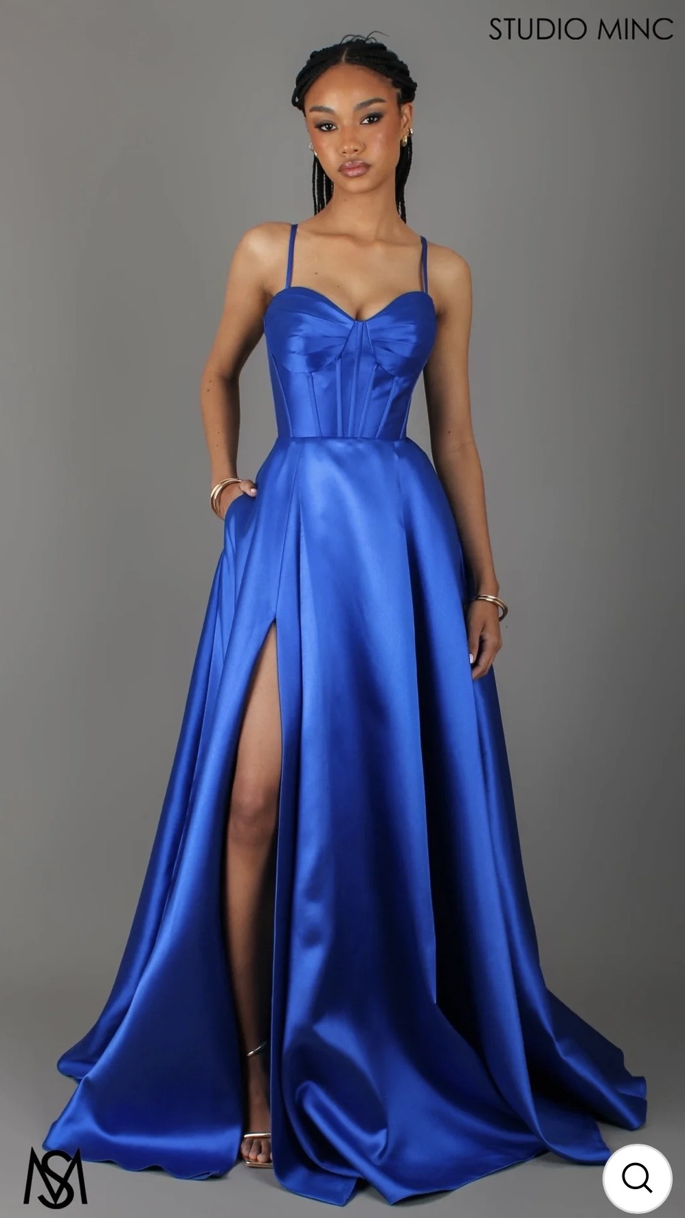 The ‘Capri’ gown is a statement ball gown with strapless corset featuring pleated bust cups and flattering diagonal boning. Combining bold colour in crisp satin mikado, the skirt is a full circle gown with pleats, leg slit and pockets. Stand out in Capri for formals, prom, balls, and black-tie events.