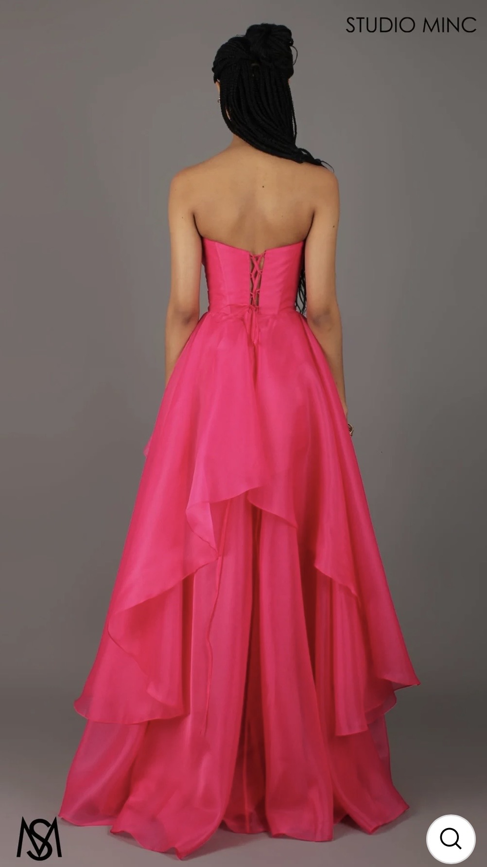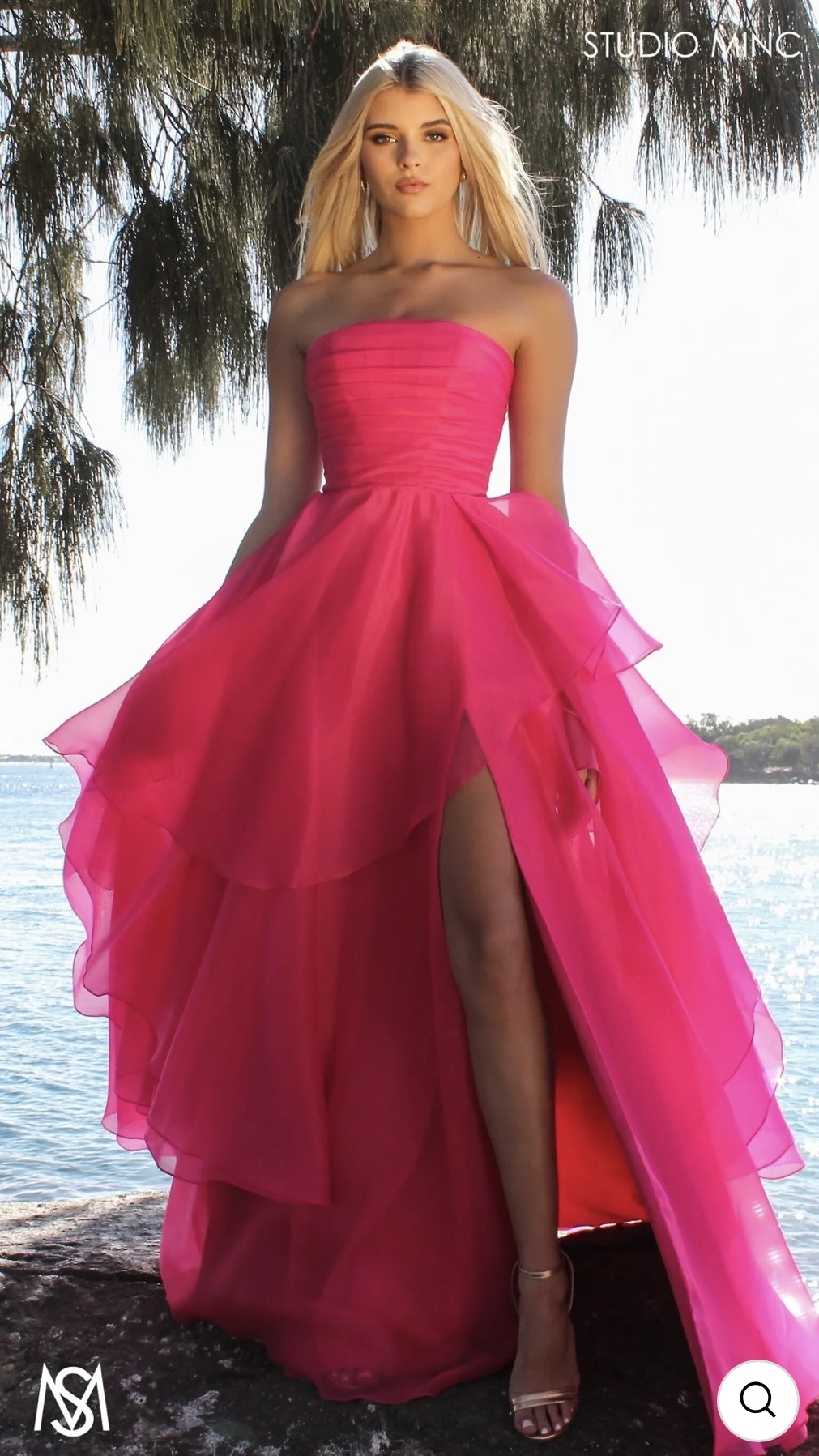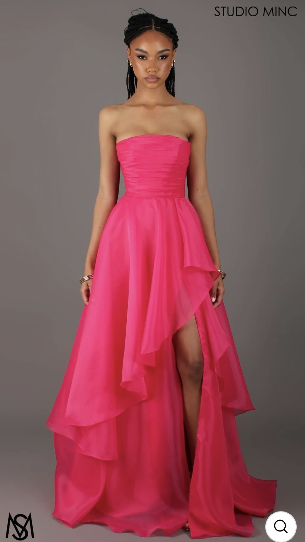 Monaco is a stunning statement formal gown, perfect for a standout formal or prom dress. The design features a strapless bodice with visible boning underneath pleated organza. Monaco’s statement feature is the layered handkerchief skirt with high leg slit.
