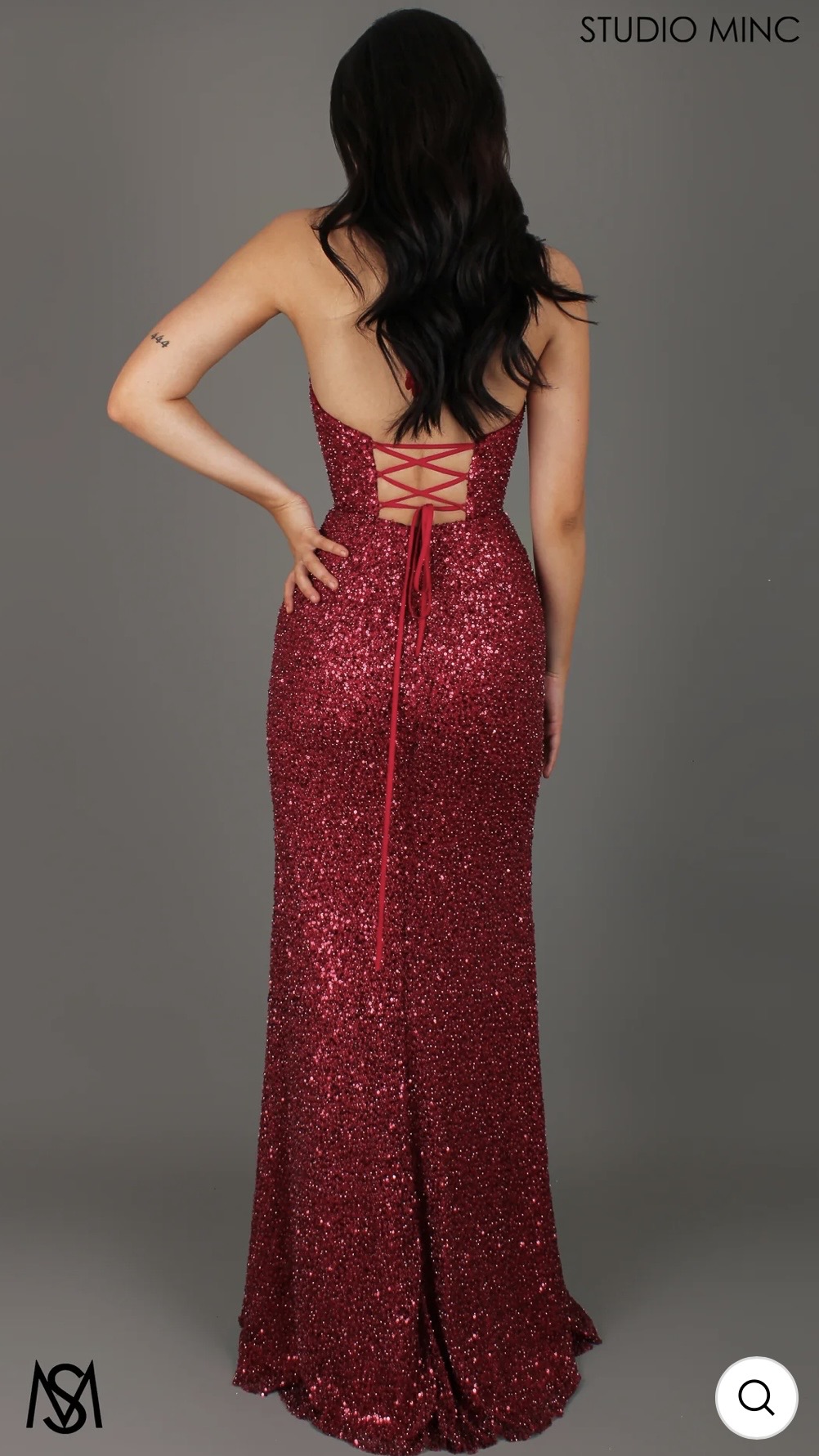 Rendezvous is a sleek and stylish evening dress, embellished with sparkly sequins and glass beads! The mermaid silhouette has built in bra cups with a plunging cowl neckline and adjustable neck tie. The back has a lace up for a snatching fit. The skirt has a high leg slit.