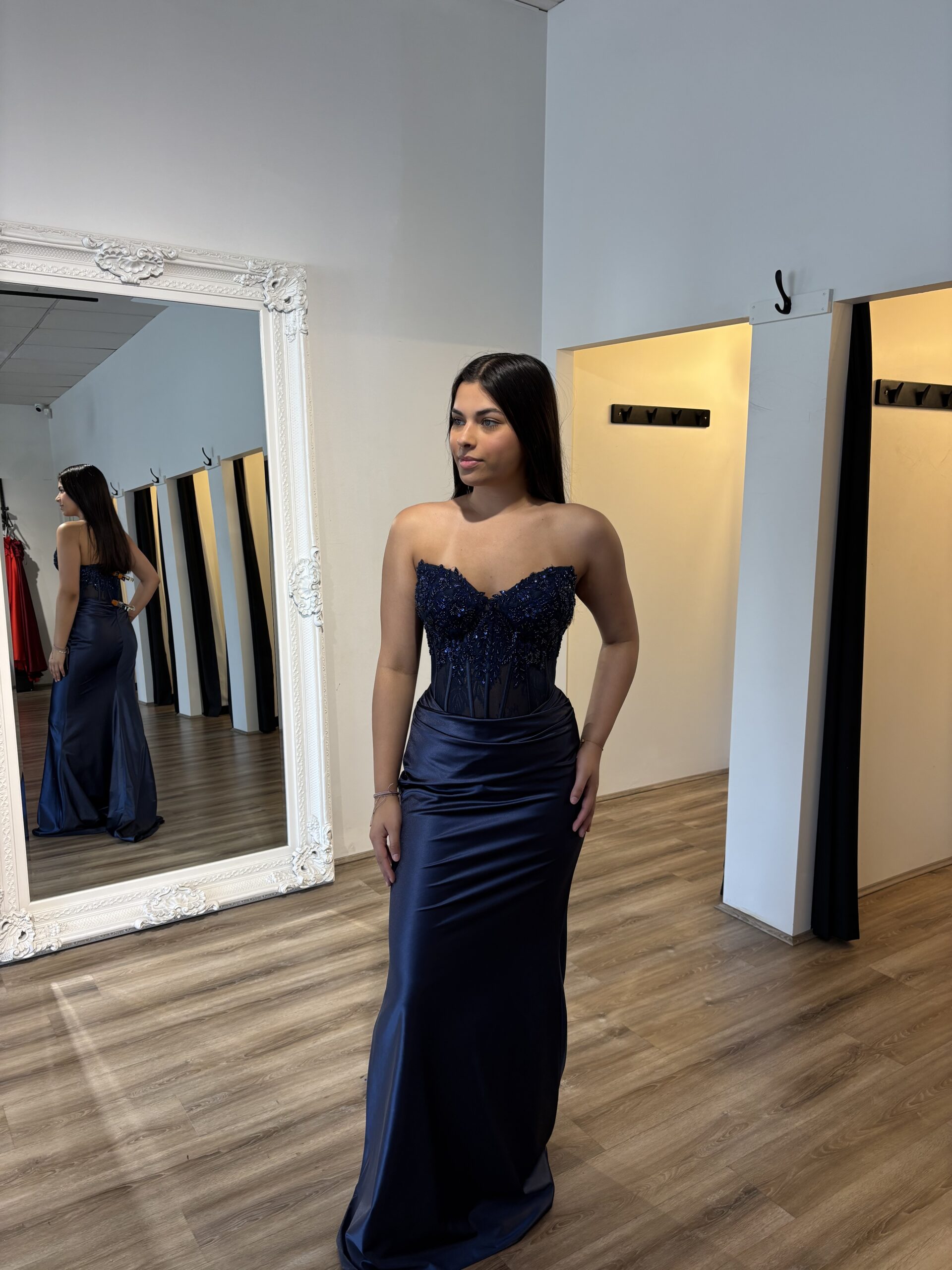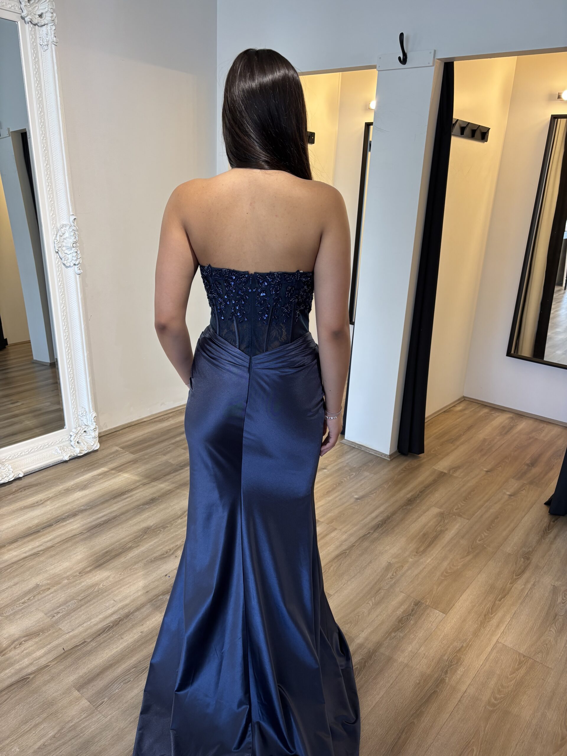 The dropped V front waistline adds a sophisticated touch, while the detachable flat lace beaded straps provide versatility in styling. The fitted mermaid skirt, featuring upper hip gathers, beautifully accentuates the figure.