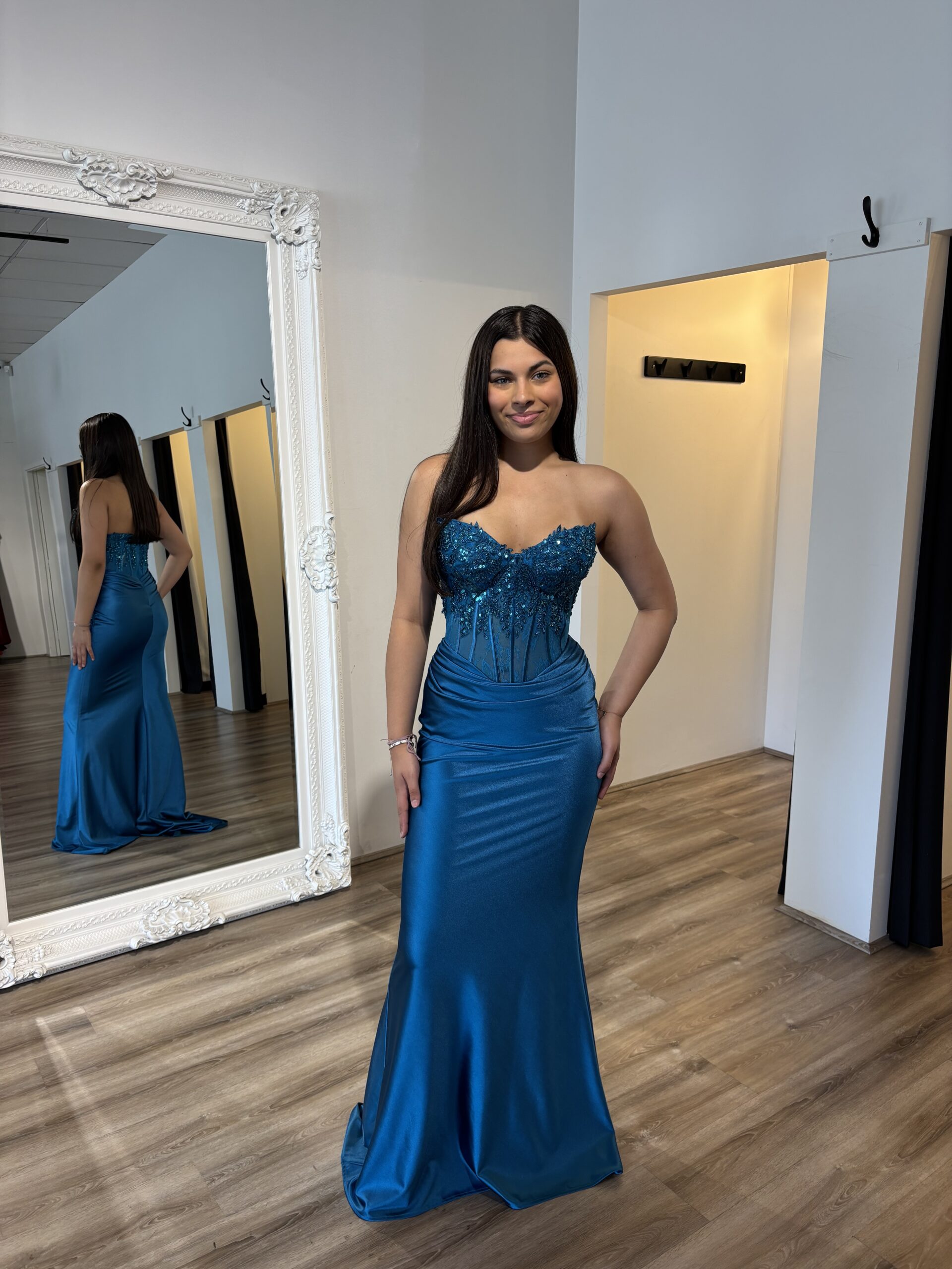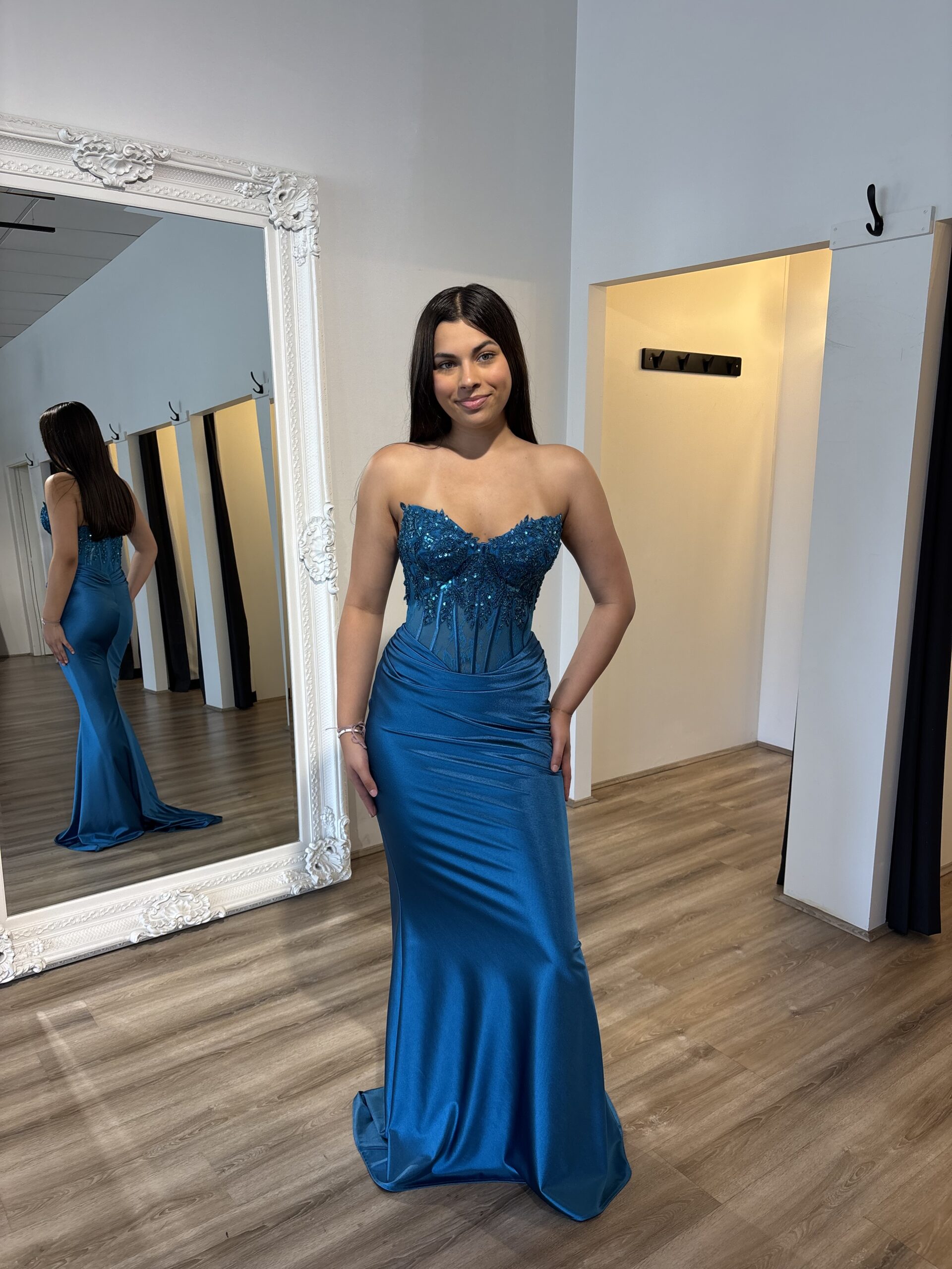 The dropped V front waistline adds a sophisticated touch, while the detachable flat lace beaded straps provide versatility in styling. The fitted mermaid skirt, featuring upper hip gathers, beautifully accentuates the figure.
