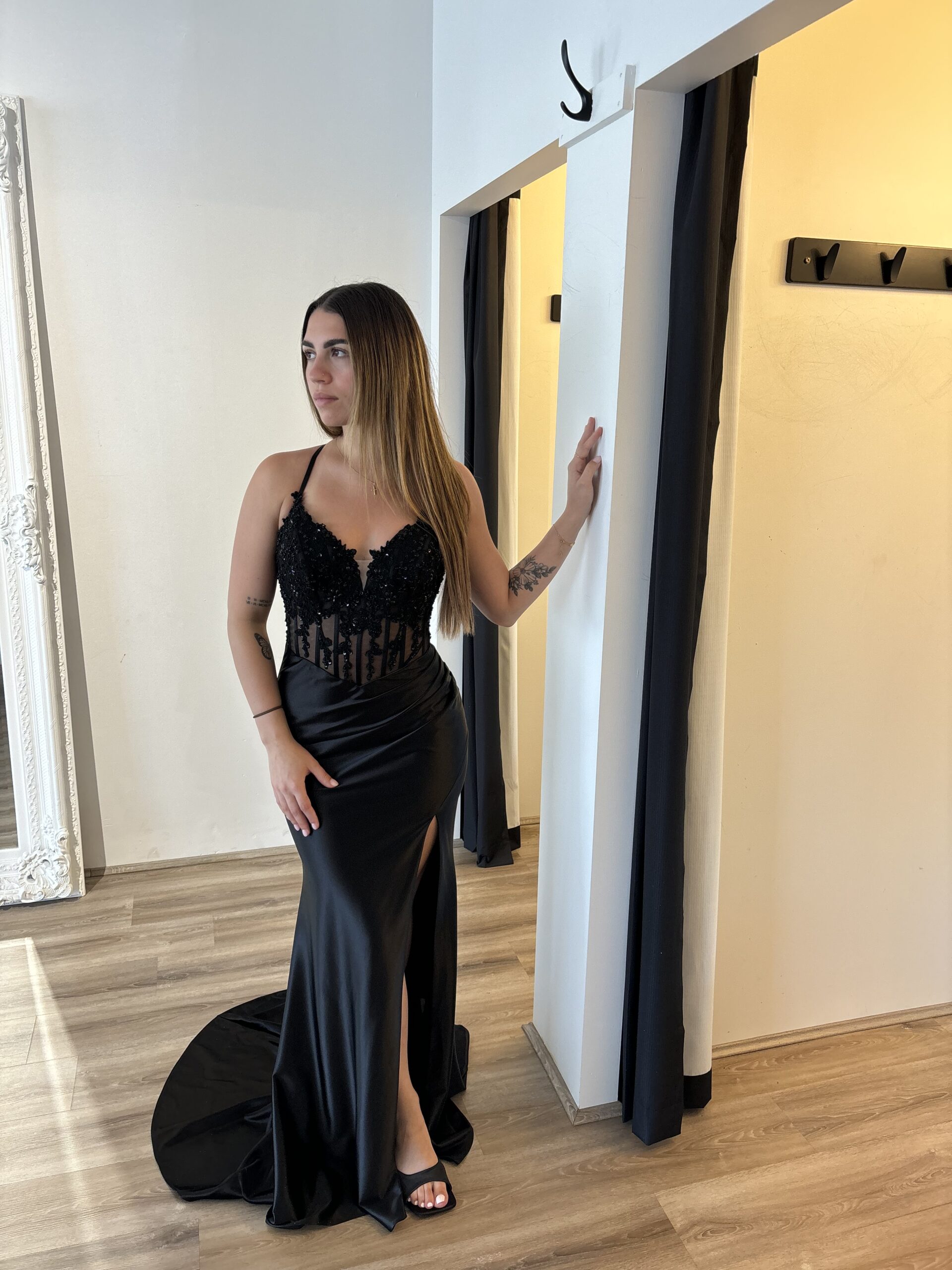 The Tarni Formal Dress is a captivating blend of modern allure and timeless sophistication, designed to ensure you’re the star of the show at your special event! Crafted from a luxurious combination of stretch satin and intricate lace appliqué, this dress exudes sheer elegance.