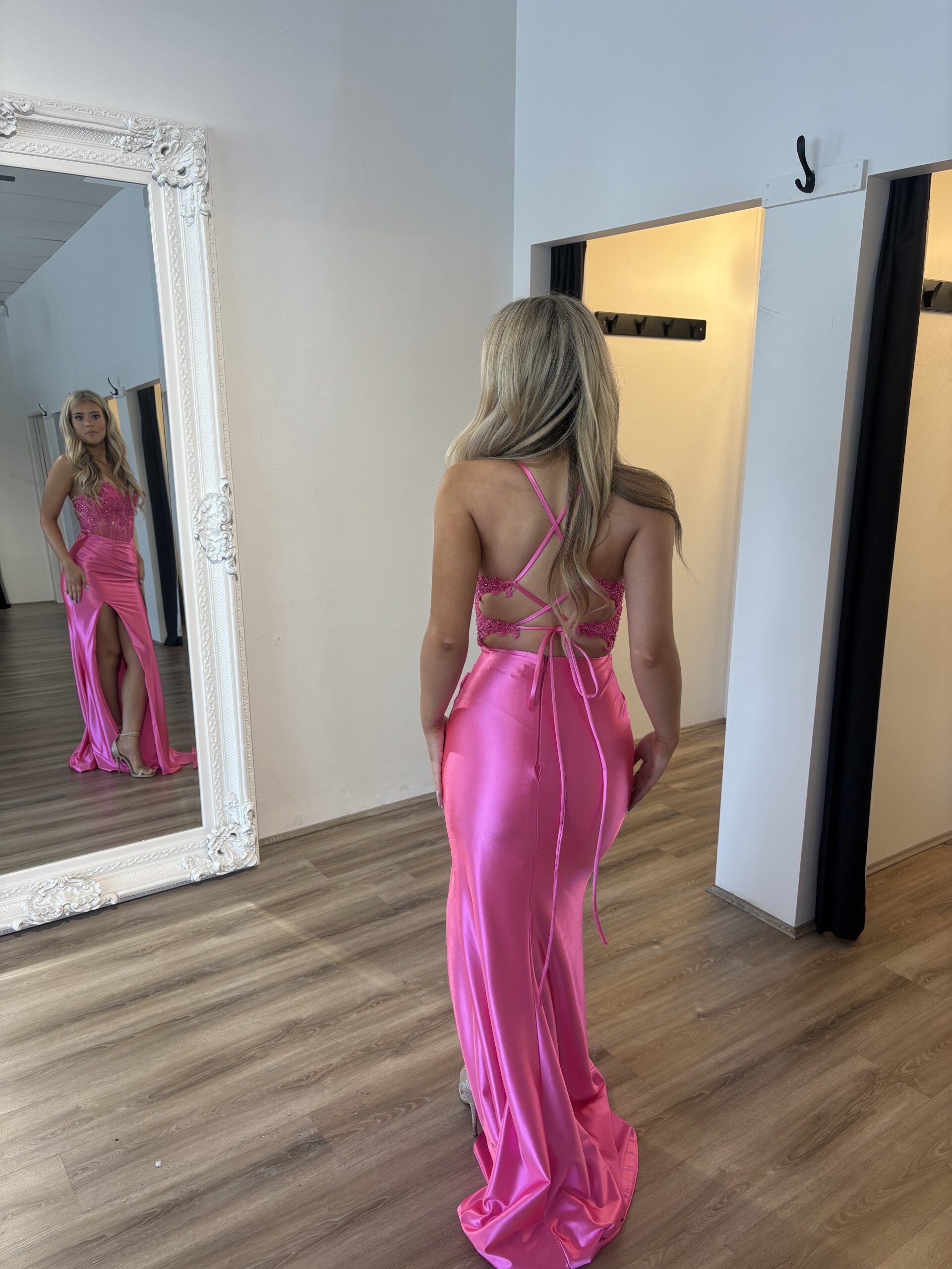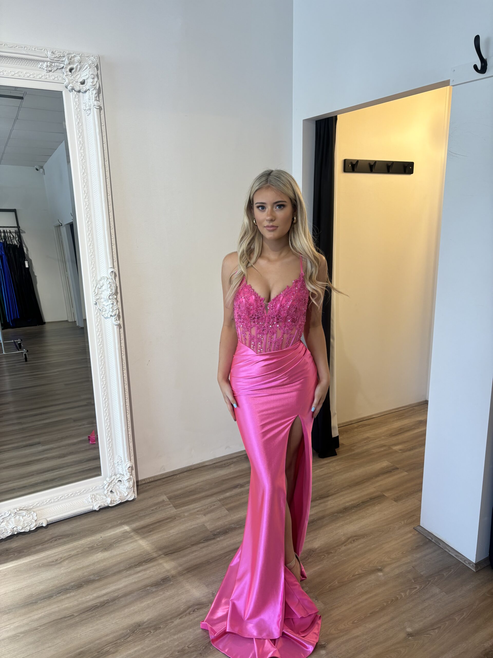 The Tarni Formal Dress is a captivating blend of modern allure and timeless sophistication, designed to ensure you’re the star of the show at your special event! Crafted from a luxurious combination of stretch satin and intricate lace appliqué, this dress exudes sheer elegance.